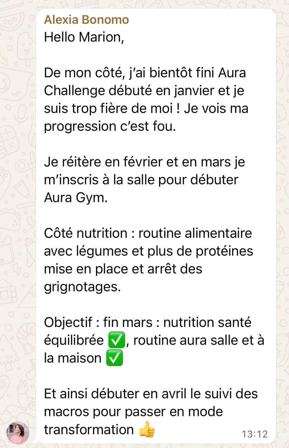 Le Challenge AURA inclut un accompagnement via un groupe WhatsApp exclusif. Tu y recevras toutes les annonces importantes et pourras échanger avec les autres participantes.