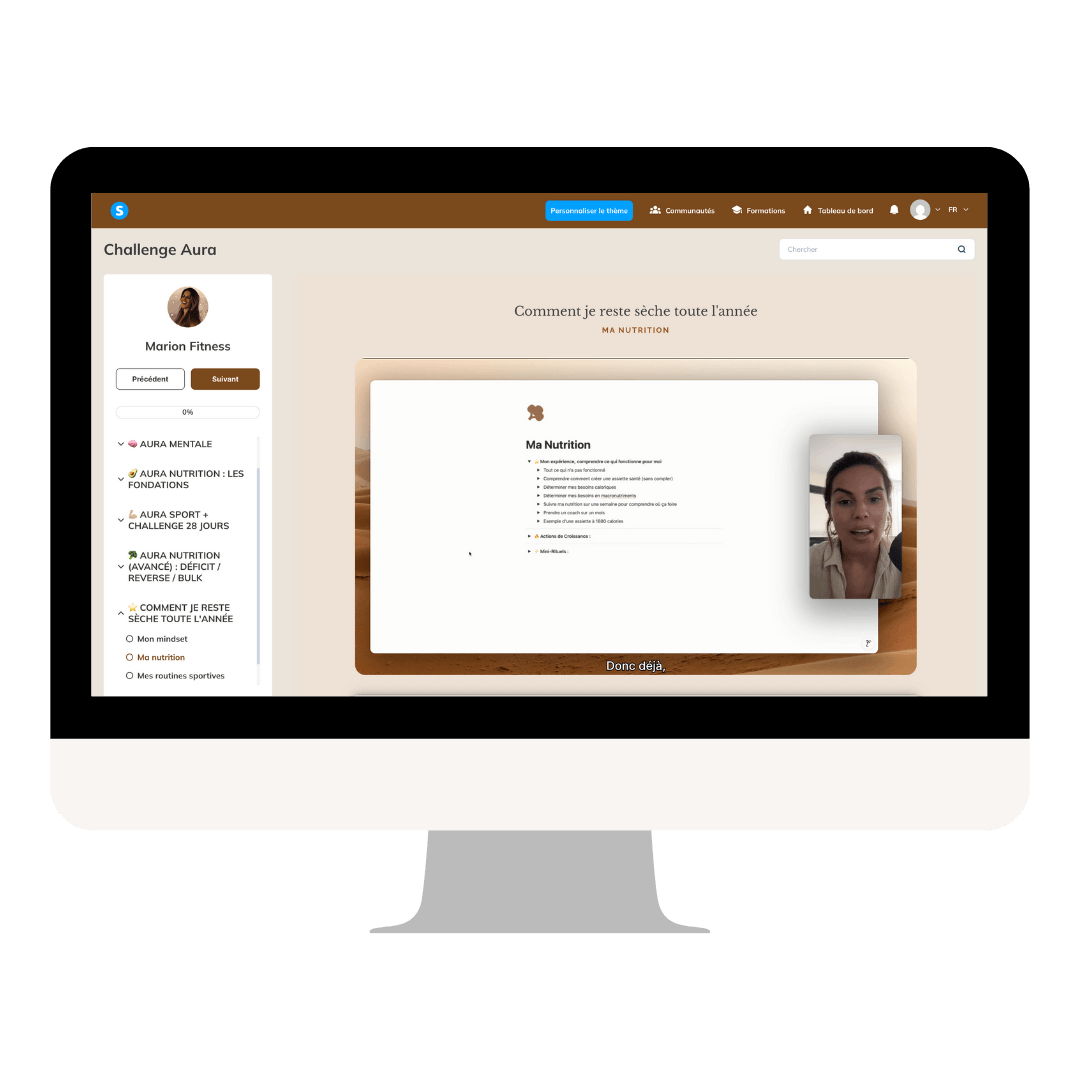 Le Challenge AURA est une expérience immersive qui combine des vidéos sur des thématiques autour du mindset et de la nutrition, des séances enregistrées à réaliser chez toi, des séances en autonomie en salle de sport et des vidéos bonus. L'objectif est de transformer ton corps, ton état d'esprit et ta posture au monde en renforçant ton core et en changeant ta nutrition, tout en développant un mindset puissant pour déployer ton aura et révéler ton potentiel.